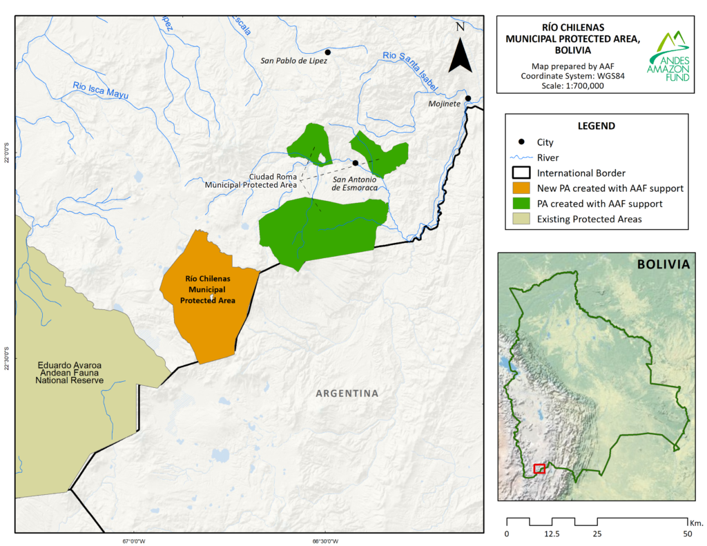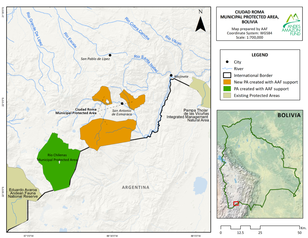 The establishment of the Río Chilenas Municipal Protected Area and Ciudad Roma Municipal Protected Area was made possible by the Municipal Government of San Antonio de Esmoruco alongside the local communities and authorities of Río Chilenas and Ciudad Roma and the Communal Indigenous Territory (TIOC) belonging to the Lliphi Indigenous Peoples with the technical support of Protección del Medio Ambiente Tarija (PROMETA), Organización De Turismo Corredor Altoandino Hito 5 Y 6, and the Centro De Madres De Río Chilenas. Financial support for PROMETA was provided by the Andes Amazon Fund and Conserva Aves.