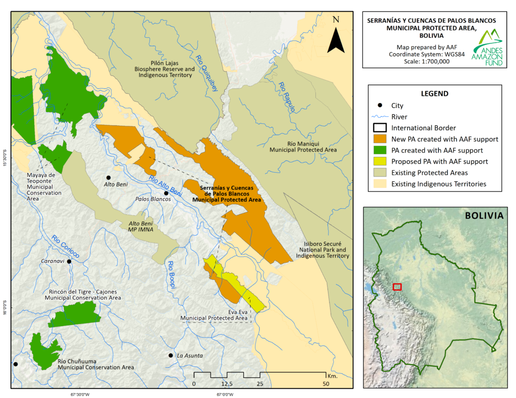 The Serranías y Cuencas de Palos Blancos Municipal Protected Area is directly adjacent to the Moseten Indigenous Territory and the Pilón Lajas Biosphere Reserve and Communal Lands which strengthens the Madidi-Amboró biodiversity corridor by providing additional connectivity.