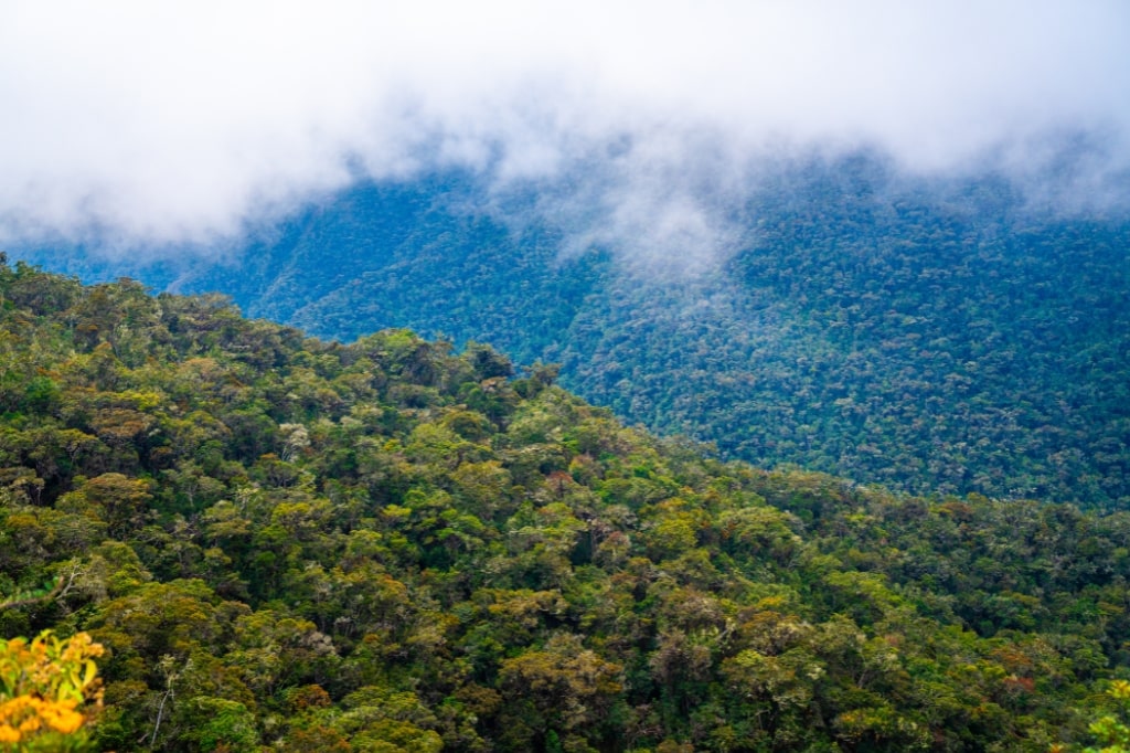 Margarita Medina (Andes Amazon Fund) speaking at the Convention (left) and cloud forest in the Bosques de Shunte y Mishollo Regional Conservation Area in San Martín, Peru (right). © Judah Marsden / Andes Amazon Fund