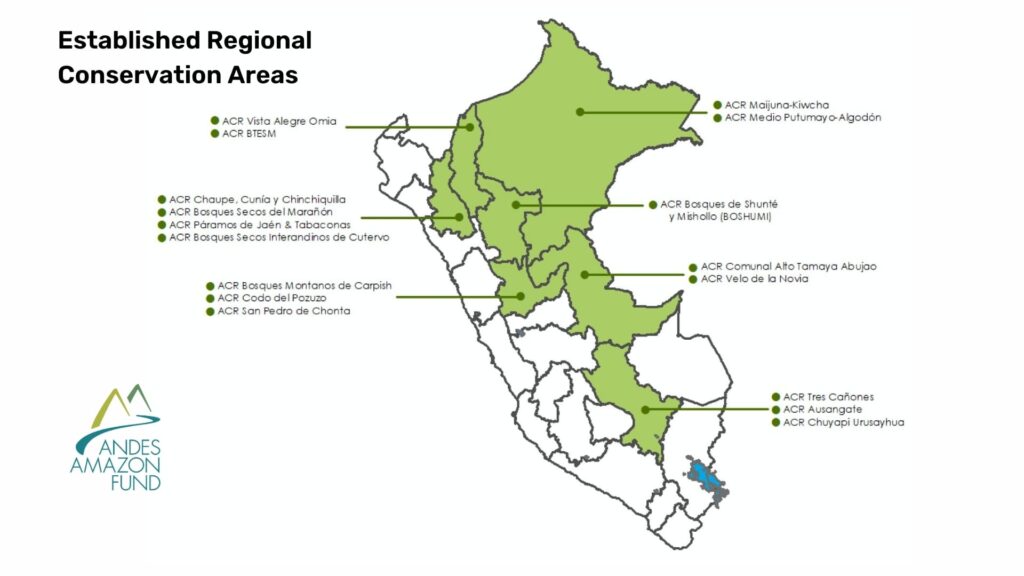 Map identifying the 17 Regional Conservation Areas in Peru established with funding support from Andes Amazon Fund.