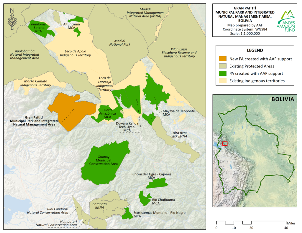 Gran Paitití de Mapiri serves as a connectivity corridor for wildlife moving between the Amazonian lowlands and the Andean highlands, contributing to a broader conservation mosaic that connects some of Bolivia’s most important protected areas, such as Cotapata and Madidi National Parks. Additional areas strengthened as part of the conservation mosaic include the neighbouring Leco de Larecaja Indigenous Territory and the Puerta Amazónica, Dowara Kanda Tech Uyapi, Mayaya de Teoponte, Guanay, Rincón del Tigre – Cajones, Rio Chuñuuma, and Alto Beni Municipal Protected Areas. Ecological connectivity is also strengthened with the Apolobamba Integrated Natural Management Area in La Paz as well as the Isiboro-Sécure Indigenous Territory and National Park (TIPNIS) and Carrasco National Park in Cochabamba.