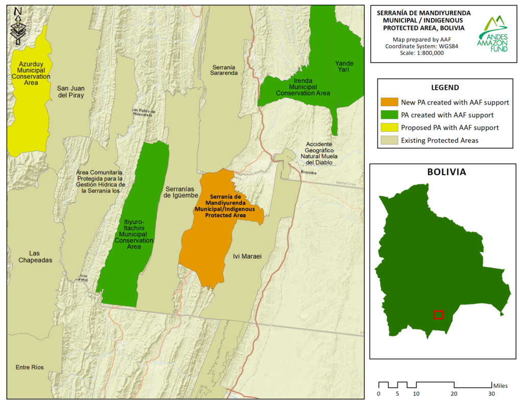 As a Natural Integrated Management Area, Serrania de Mandiyurenda enables the conservation of natural resources while sustaining the livelihoods and social systems of communities living within its boundaries. The new protected area is the home of 14 Guaraní and campesino communities and the administration of the area will be coordinated by the Indigenous Guaraní Huacaya Autonomous Government and communities.